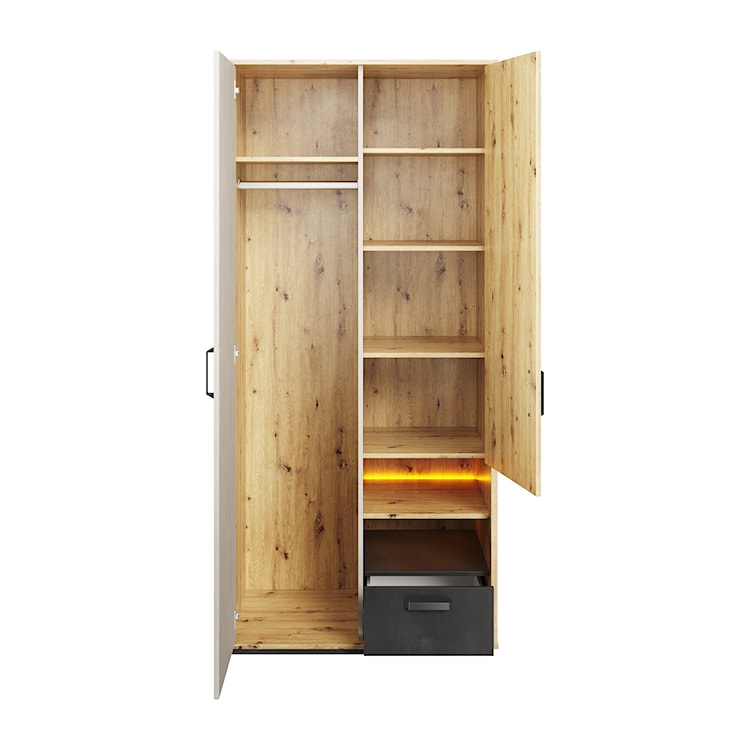 Dzieci dorastają, a wraz z nimi rośnie ich poczucie indywidualności i potrzeba jej wyrażania. W związku z tym młody człowiek szybko odkrywa, że najlepszym sposobem na wyrażenie własnego stylu są odpowiednio dobrane dodatki i akcesoria. Co zatem zrobić, by ich większa części nie wylądowała na podłodze? Wystarczy tylko sięgnąć po pełną wdzięku szafę dwudrzwiową należącą do kolekcji Qubic i w ten sposób podarować młodemu człowiekowi sposób na utrzymanie porządku! Oferowany przez nas model wzbudza zachwyt unikatowym projektem oraz budową, za sprawą których znajdzie się miejsce dla wszystkich rzeczy, a sam mebel stanie się ozdobą każdej przestrzeni. W środku mebla, za jednym skrzydłem drzwiowym, umieszczona została pojemna komora z wysoko osadzonym drążkiem, który pozwoli Twojej pociesze schludnie rozwiesić odzież. Ponad drążkiem znalazła się zaś obszerna półka. Drugie skrzydło drzwiowe chroni zaś przed ciekawskimi spojrzeniami gości cztery wnęki, które świetnie rozprawią się z poskładanymi w kostkę ubraniami czy akcesoriami w pudełkach. Natomiast u dołu są dwie otwarte półki – fantastycznie nadające się do wyeksponowania najcenniejszych drobiazgów – oraz praktyczną szufladę. Szafa Qubic wyróżnia się również geometryczna, modną bryłą, którą umiejętnie podkreśla przyjemne wybarwienie.