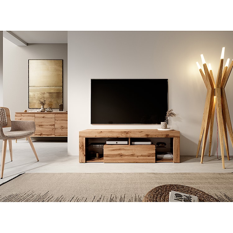 Konstrukcję wykonano z wysokogatunkowej płyty laminowanej, dzięki czemu mebel zostanie z Tobą na lata. Mebel wyposażono w pojemny, zamykany schowek, który pozwoli ukryć dodatkowe przewody, czy piloty. Drzwiczki otwierane są w dół, systemem push to open. Szafkę wyposażono również w cztery praktyczne wnęki, w których wygodnie umieścisz sprzęty, takie jak dekoder czy konsola do gier. Mebel nie posiada zabudowanego tyłu, dzięki czemu z łatwością uporządkujesz wszelkie przewody i kable.