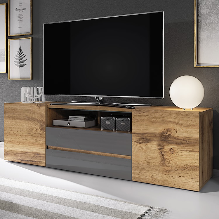 W prostocie tkwi siła. Konstrukcja, oszczędna w ozdobniki, wsparta jest na małych, lecz silnych, nóżkach z tworzywa. Front szafki to błyszcząca, laminowana płyta, która dostanie niesamowitego połysku, w momencie gdy ustawisz w swoim salonie odpowiednie oświetlenie. Korpus w kolorze dębu wotan, wykończony w macie, wniesie zaś powiew świeżości i nada pomieszczeniu naturalny charakter, który oczaruje każdego. Takie połączenie kolorów spowoduje że Twój salon zyska na oryginalności.