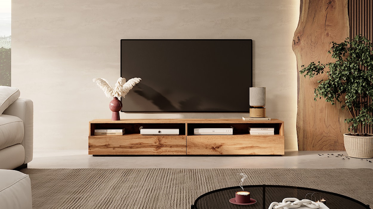 Nowoczesna szafka RTV należąca do kolekcji Rednaw to propozycja stworzona z myślą o wyrafinowanych odbiorcach, którzy cenią nietuzinkową stylistykę i z radością podążają za nowoczesnymi trendami. Ten piękny mebel charakteryzować będzie się zatem przyjemnym w odbiorze minimalizmem i geometrycznymi, wyrazistymi liniami, które uczynią z niego prawdziwie atrakcyjne dopełnienie nie tylko współcześnie zaaranżowanego salonu, ale również funkcjonalnej sypialni czy futurystycznego pokoju gracza. Dodatkowo produkt zauroczy każdego swoją dużą pojemnością, która pozwala mu wspaniale zapanować nad praktycznie każdym elektronicznym chaosem. Znajdziemy tutaj bowiem dwie otwarte wnęki usytuowane u góry oraz dwa schowki zamykane parą klap. Takie rozwiązanie oferuje wiele miejsca i sposobności do poukładania Twoich przedmiotów tak, jak lubisz, dzięki czemu codziennie będziesz cieszyć się piękną i stylową kompozycją. Dodatkowo otwarte komory pozwalają na umieszczenie w nich najczęściej używanego sprzętu, co pozwoli na właściwy dopływ powietrza, chroniąc elektronikę przed przegrzaniem. Całość dopełnia szeroki, przestronny blat, na którym bez problemu postawisz telewizor lub najpiękniejsze z Twoich skarbów.