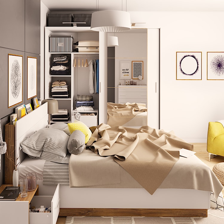 Nasz produkt zachwyca nie tylko swoim eleganckim wyglądem garściami czerpiącym ze skandynawskiej stylistyki, ale także praktycznymi rozwiązaniami, które każdemu umilą wypoczynek. Łóżko wyposażone zostało w funkcjonalną półkę gustownie ukrytą w zagłówku, dzięki którym wszystkie potrzebne Ci wieczorem rzeczy, np. książki czy tablet, będziesz mieć pod ręką. Umieszczone w konstrukcji przepusty kablowe niezastąpione okażą się zaś wtedy, gdy będziesz chcieć podładować telefon lub laptopa. Dodatkowo z boku zagłówka została umieszczona taśma LED, dająca subtelne rozproszone światło. W spodzie łóżka znalazło się miejsce na wytrzymały stelaż szczebelkowy osadzony w metalowej ramie – takie rozwiązanie znacząco zwiększy komfort Twojego materaca i zapewni mu odpowiednią cyrkulację powietrza. Niżej znajduje się zaś ogromny pojemnik na pościel. Dzięki zastosowaniu nowoczesnych podnośników gazowych łóżko podniesie się i umożliwi Ci dostęp do schowka. Mebel zbudowany został z najwyższej jakości płyty laminowanej, co zapewniło mu wysoką trwałość oraz odporność na zarysowania. Brzegi konstrukcji wykończonej obrzeżem ABS, które nie tylko pięknie się prezentuje, ale także chroni płytę przed szkodliwym działaniem wilgoci.