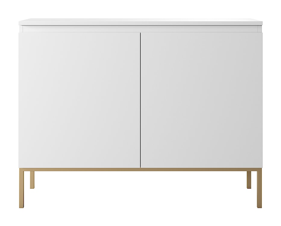 Szafka RTV Bemmi to uniwersalna bryła, usytuowana na wąskich, stalowych nóżkach, które nadają całości wizualnej lekkości. Połączenie bieli ze złotymi nóżkami doskonale odnajdzie się nie tylko w minimalistycznym, ale także nowoczesnym wnętrzu, z nutką glamour. Przestrzeń wewnątrz mebla podzielona została na cztery praktyczne półki, które z powodzeniem pomieszczą wszystkie Twoje rzeczy. Atutem mebla są wysokie nóżki, które bez problemu pozwolą utrzymać czystość pod meblem, również robotom sprzątającym.