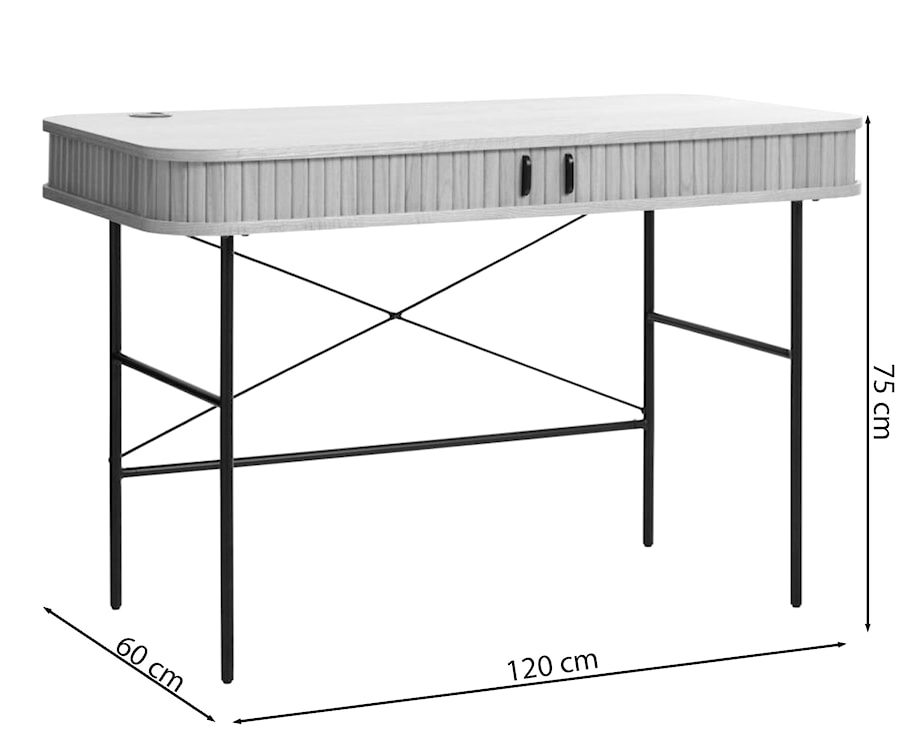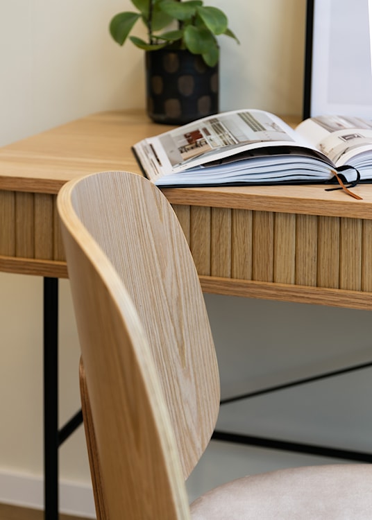 Biurko Gativel to prawdziwe wybawienie dla osób, które chcę stworzyć miejsce idealne do pracy. Ten stylowy mebel pochwalić się może parą drzwiczek, które w ciekawy sposób otwierają się na boki, ukazując oczom użytkownika aż dwie przestronne wnęki. Z łatwością poukładasz tutaj akcesoria biurowe lub dokumenty, czy inne potrzebne Ci w codziennym życiu rzeczy – tak, by pozostały one skryte przed wzrokiem zaproszonych do domu gości. Dzięki temu wnętrze zacznie prezentować się schludnie i elegancko, a Ty zyskasz bezpieczny schowek na swoje skarby! Gativel stawia na naturalną kolorystykę dopełnioną elementami z malowanego na czarno metalu. Takie połączenie nie tylko zachwyca pięknem, ale również wzbudza uznanie swoją trwałością oraz niepodatnością na uszkodzenia mechaniczne. Całość dopełnia urocze ryflowanie na froncie.
