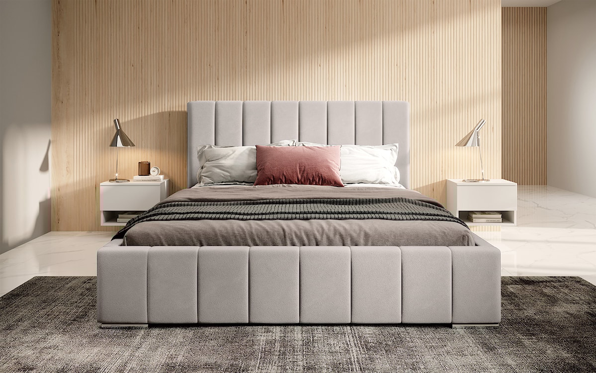 - łóżko obite tkaniną Velluto 01 w kremowym kolorze,
