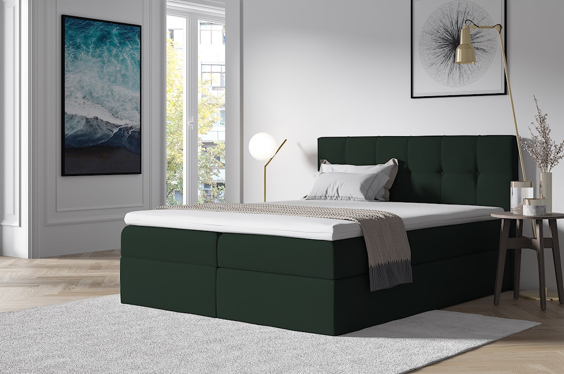 Verdeni to wykonane z wyjątkowym gustem łóżko kontynentalne o stylowych opakowaniach na wezgłowiu. Idealnie dopełni wszelkie sypialnie w stylu glamour, dodając im odpowiedniego charakteru. Łóżko skrywa dwuczęściową przestrzeń na przechowywanie pościeli, znajdującą się pod materacem, dzięki której pomieścisz wiele rzeczy, zyskując porządek w sypialni. Przestrzeń ta jest w formie pojemników łatwo otwieralnych, dzięki automatowi na sprężynach. W komplecie z łóżkiem Verdeni jest materac, w skład którego wchodzą sprężyny bonellowe oraz pianka wysoko elastyczna T30 sprawiając, że pokochasz to łóżko od pierwszego położenia się na nim. Miękkości dodaje również topper o wysokości 5 cm. Całości dopełnia miła w dotyku welurowa tkanina o szerokiej gamie kolorystycznej, dzięki której na pewno znajdziesz kolor dla siebie. Nie czekaj, zamów już dziś!