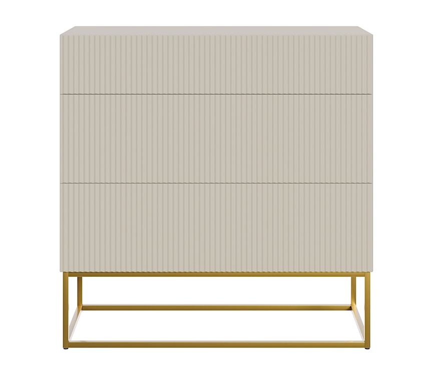 Komoda z szufladami Veldio to połączenie minimalizmu z designerskim akcentem w postaci modnych lameli. Frezowany front nadaje całości nietuzinkowego charakteru - w połączeniu z dużą, barwną roślinnością mebel będzie prezentował się naprawdę świetnie. Mebel posiada trzy, pojemne szuflady, które będą świetnym miejscem na artykuły biurowe, dokumenty lub zapasowe ręczniki. Jeśli zależy Ci na personalizacji pomieszczenia to ważne, rodzinne pamiątki lub fotografie bez wątpienia znajdą swoje miejsce na szerokim blacie szafki. Dodatkowym atutem mebla są solidne nogi w postaci ramy wykonanej ze stali malowanej proszkowo, które zapewniają mu maksymalną stabilność, będąc jednocześnie stylowym dodatkiem do salonu.