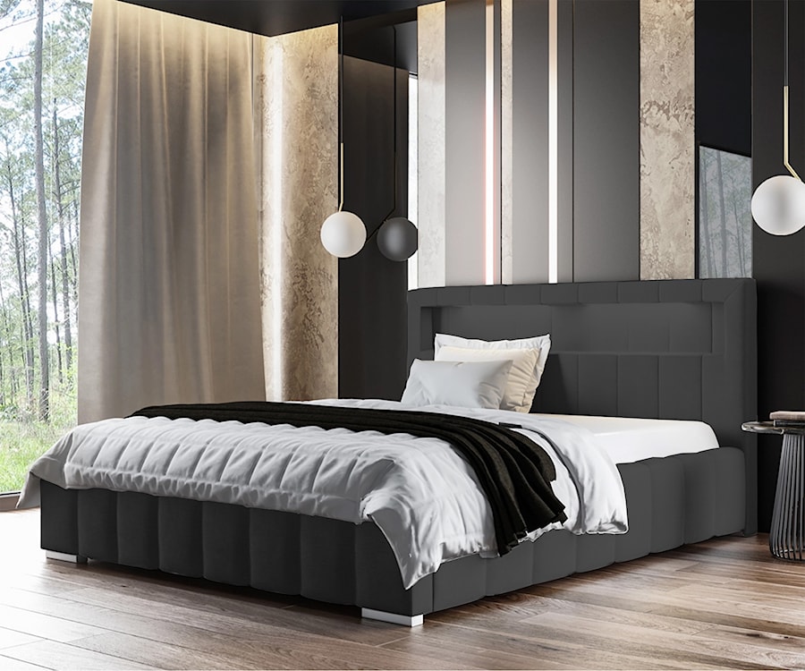 - łóżko tapicerowane o stylowych pionowych przeszyciach na wezgłowiu oraz bokach,