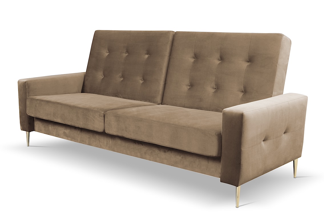 Komplet Santi to propozycja powstała z myślą o miłośnikach ponadczasowej elegancji. Kompaktowa, zgrabna bryła, ozdobiona subtelnym pikowaniem oraz smukłe, złote nóżki, tworzą produkt idealnie dopasowany do każdej nowoczesnej kompozycji mieszkania. Konstrukcja zachwyca wizualną lekkością, a także dopracowanym, przemyślanym designem. Niezaprzeczalnym atutem jest praktyczna funkcja spania, umożliwiająca nie tylko przenocowanie niezapowiedzianych gości, lecz także długi wieczorny relaks przed telewizorem lub z ulubioną książką. Proces ścielenia przebiegnie sprawnie, ponieważ wszystkie niezbędne tekstylia przechowasz w pojemnym schowku.