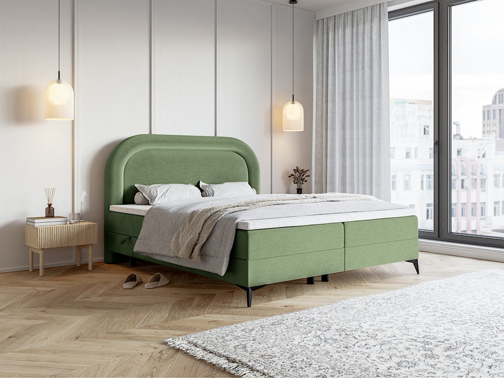 Łóżko kontynentalne Loreo to prawdziwa oaza komfortu i szyku w Twojej sypialni. Jego wezgłowie prezentuje się niezwykle efektownie dzięki zaokrąglonym kształtom, dodając wnętrzu przytulności i subtelnej finezji. Element stanowi fantastyczną podporę dla Twoich pleców podczas wieczornego seansu lub lektury ulubionej książki. Praktycznym rozwiązaniem są dwie duże skrzynie z pojemnikami na pościel, co nie tylko sprawia, że przechowywanie pościeli staje się łatwiejsze i bardziej ergonomiczne, ale także optymalizuje wykorzystanie przestrzeni w sypialni, nadając jej schludny i estetyczny wygląd. Pozwól sobie na chwile relaksu w otoczeniu luksusu i komfortu, które oferuje łóżko Loreo!