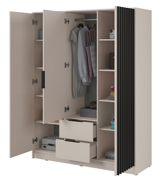 Szafa trzydrzwiowa Karette to propozycja, która zadowoli nawet najbardziej wymagającego użytkownika. Mebel ten z prawdziwą gracją godzi w sobie walory estetyczne z wysoką funkcjonalnością, oferując Ci mieszankę umożliwiając wyczarowanie zachwycającego wystroju pomieszczenia. Znajdziesz tutaj zatem estetyczną, geometryczną bryłę ożywioną atrakcyjną wstawką ze smukłych lameli. Zabieg ten spowodował, że konstrukcja zyskała nowoczesnego charakteru, jednocześnie pozostając przyjemną w odbiorze. Równie starannie zadbano tutaj także o wykonanie wnętrza mebla. Produkt pochwalić się może bowiem obecnością licznych półeczek, dwoma szufladami a nawet wnęką z praktycznym drążkiem. Oznacza to, że z łatwością rozprawi się z Twoimi ubraniami – zarówno codziennymi, jak i tymi bardziej eleganckimi, bielizną, butami czy pochowanymi w pudłach i organizerach drobiazgami, bez których nie wyobrażasz sobie codziennego funkcjonowania.